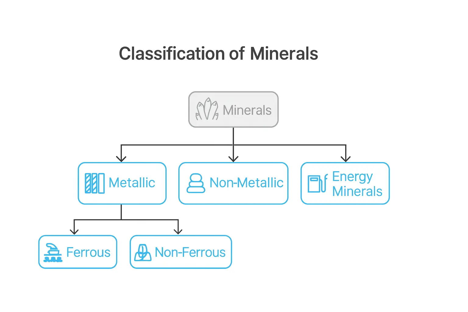 - Ferrous (contain iron): Iron ore, manganese, chromite
